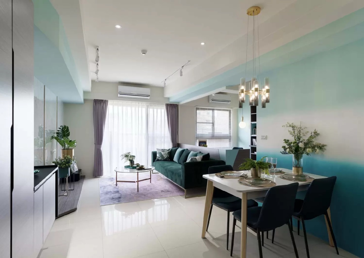 漸變色的墻面搭配淺綠色的沙發配色,營造一種海水的色彩,猶如在海的世界一樣,自由、舒適。